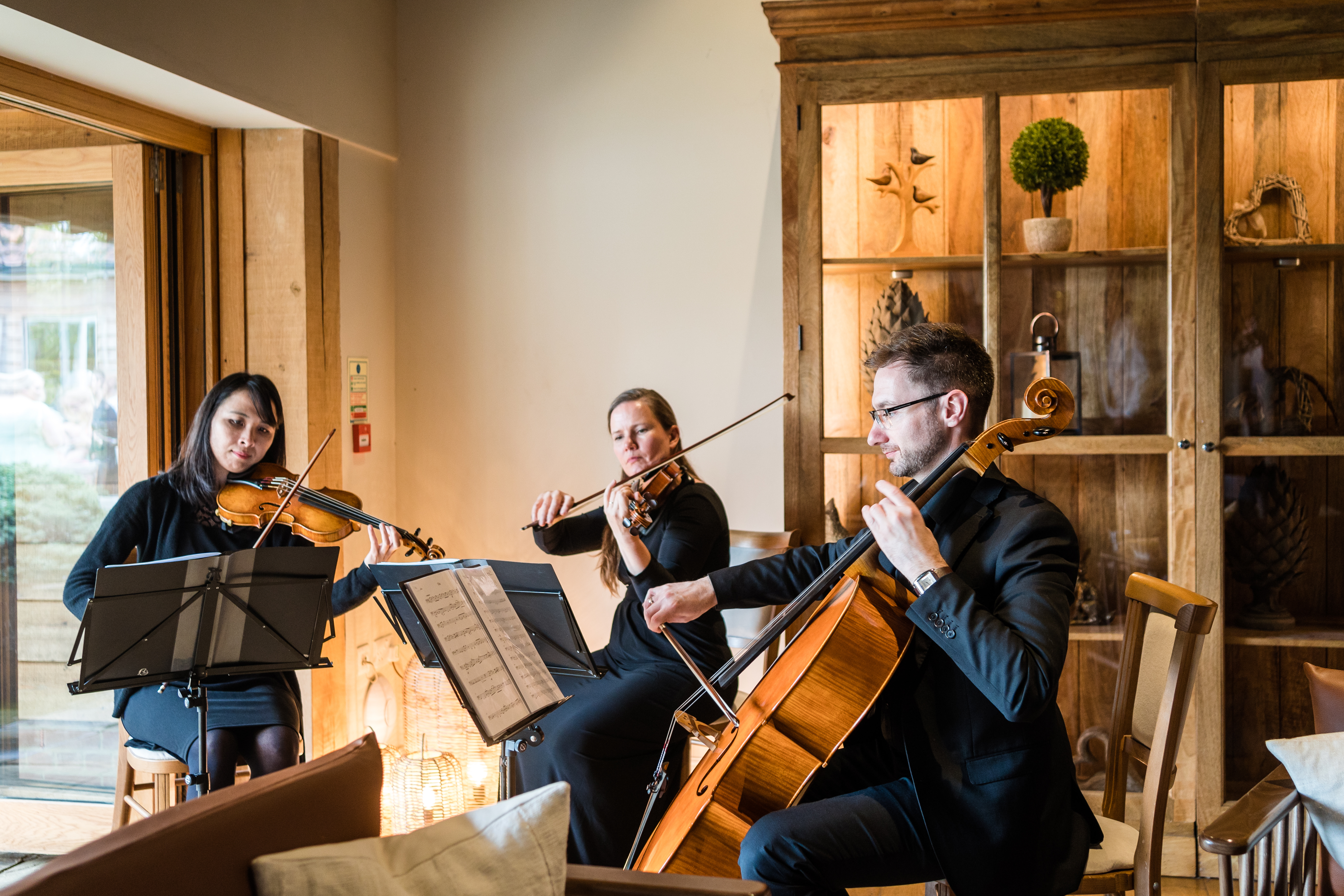 A string trio has three musicians, so the sound might be considered a little lighter than that of a string quartet. That said, with skilfully arranged music, our trio creates an incredibly full, warm sound which resonates with rhythmic vitality and harmony. Guests at weddings and events always comment on the sound we make and the variety of music we play.