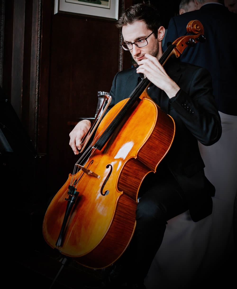 Chris, cellist of the Scintillo String Quartet at Gosfield Hall in Essex by Sally Rawlins